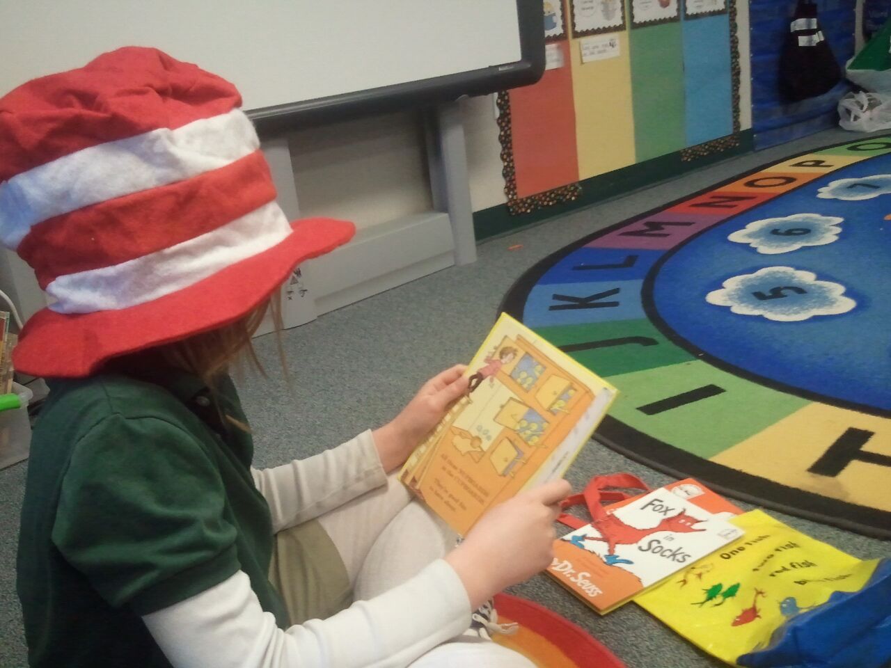 I bought some Dr. Seuss bags at Target a few years ago. We use these for "Reading Rugs" this week. I fill the bags with several different Seuss books and a hat. Kids take a colorful rug and find a place to practice read-to-self. I made pointers that look like truffula trees by hot gluing pom-poms the end of pencils and wrapping them with pipe cleaners. They love using these to track their words. Reading Rugs are also a fun way to do read-to-someone.